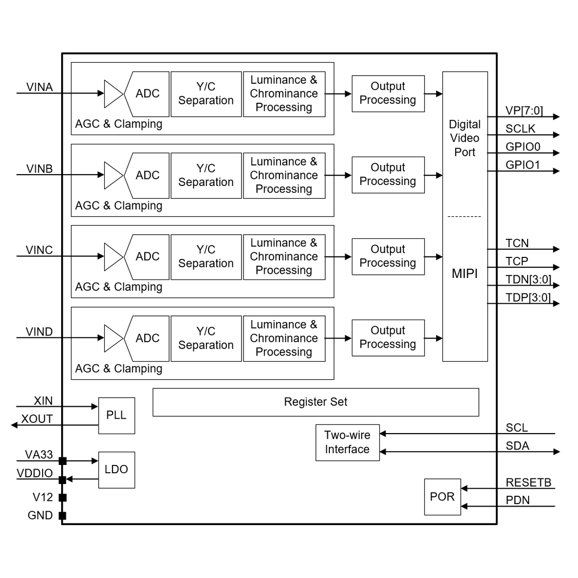 RN6854V1N is a 4-channel video decoder optimized for surround view application for passenger and commercial vehicles.This versatile multi-channel decoder can also be used in many video capture situations where video sources of different resolution and frame rate are converted and aggregated in a 4-lane MIPI link with virtual channel. This small foot print device enables a system design of high video channel density.Applications